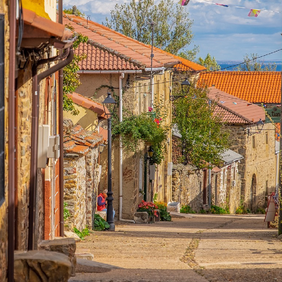 Recorremos la comarca del Bierzo, cruzando paisajes de viñedos y cultivos. En Villafranca del Bierzo, destacamos la iglesia de Santiago, famosa por su Puerta del Perdón, que solo se abre en los años jacobeos.