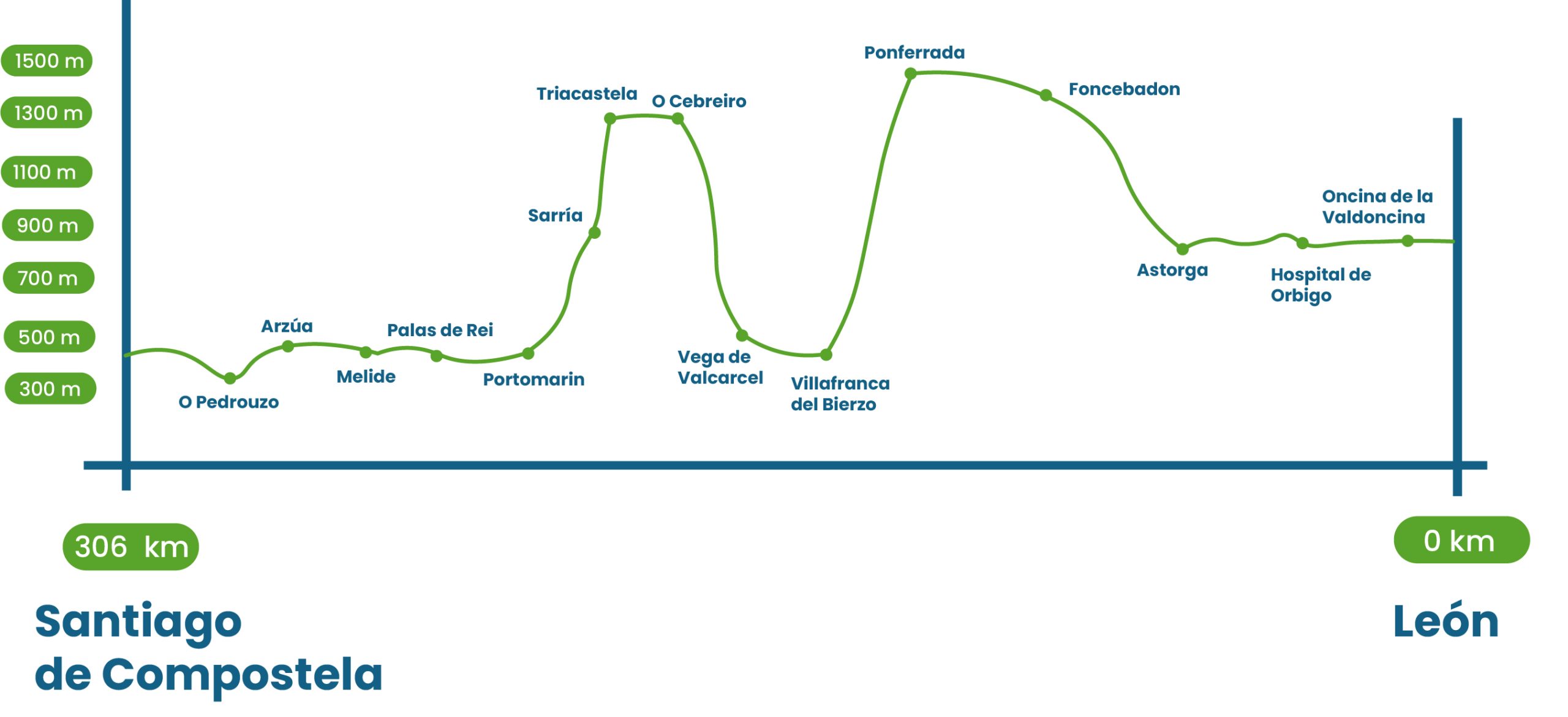 El Camino Francés desde León a Santiago de Compostela comienza en la llanura castellana, con terreno accesible al principio. A medida que nos acercamos a Galicia, el terreno se vuelve más desafiante, con ascensos como el Monte Irago y la famosa subida a O Cebreiro. Ya en Galicia, el camino atraviesa bosques y pueblos con gran tradición jacobea como Sarria, Portomarín, Melide y Arzúa. El tramo final nos lleva al Monte do Gozo, donde las primeras vistas de la Catedral de Santiago marcan el final de la peregrinación.